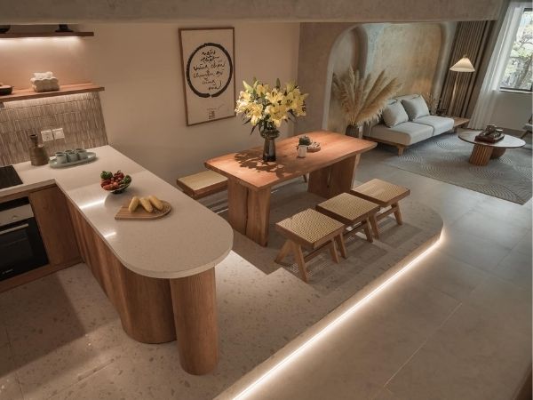 Đối với các căn hộ chung cư, thường sẽ ứng dụng phong cách này nhiều nhất. Song, nhà phố khi lựa chọn phong cách thiết kế hiện đại cũng sẽ vận dụng lối thiết kế mở tương tự chung cư. Nghĩa là chủ nhà thường sẽ thiết kế phòng khách liền phòng bếp để tối ưu diện tích và thuận tiện khi di chuyển thay vì tạo các bức tường khô cứng, bí bách ngăn chia 2 không gian. Chưa kể việc thiết kế này còn giúp tạo được sự thống nhất trong lối thiết kế, tăng thêm sự thoáng đãng, rộng rãi.