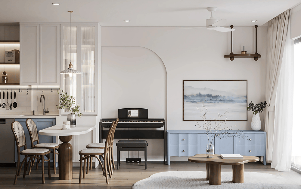 Gam trắng vẫn là chủ đạo, nhưng năm 2026, hãy thử làm mới với các sắc độ pastel nhẹ nhàng hơn. Thay vì chỉ có những màu cơ bản, hãy kết hợp thêm xanh mint, vàng bơ hay hồng phấn cho các chi tiết nhỏ như gối tựa, chậu cây, hay một chiếc ghế bành. Sự kết hợp này mang lại cảm giác tươi mới, nhẹ nhàng, đúng với tinh thần "hygge" - ấm cúng và hạnh phúc của người Bắc Âu.