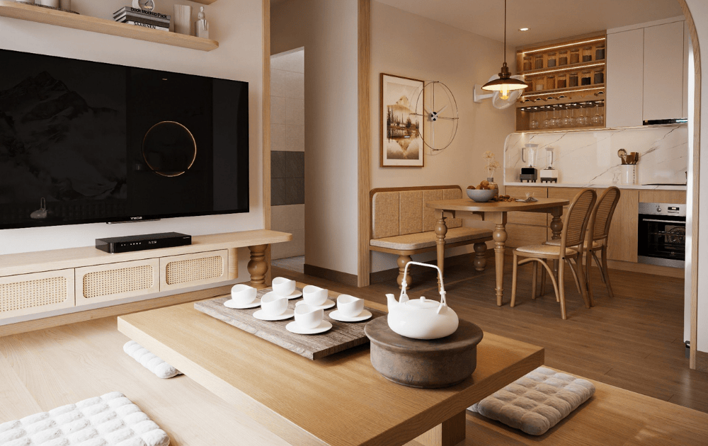 Điểm nhấn của phong cách Wabi-sabi nằm ở việc trân trọng những vật liệu tự nhiên và các dấu vết của thời gian. Các gam màu này sẽ giúp làm nổi bật vẻ đẹp của sự giản dị, của những vết rạn nứt hay sự không đồng đều, biến chúng thành một phần của câu chuyện không gian.