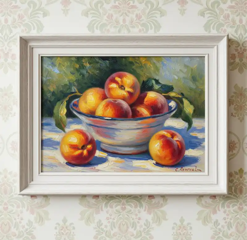 Đây là lựa chọn kinh điển và an toàn nhất. Những hình ảnh như giỏ hoa quả căng mọng, ly rượu vang sóng sánh hay những hạt cà phê nâu bóng mang lại cảm giác tươi mới. Trong văn hóa Á Đông, tranh trái cây trĩu quả còn mang ý nghĩa về sự no ấm, sung túc cho gia chủ.