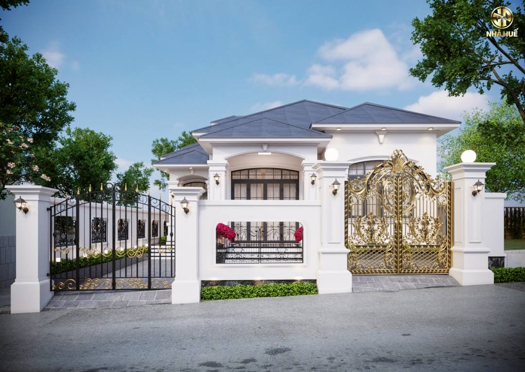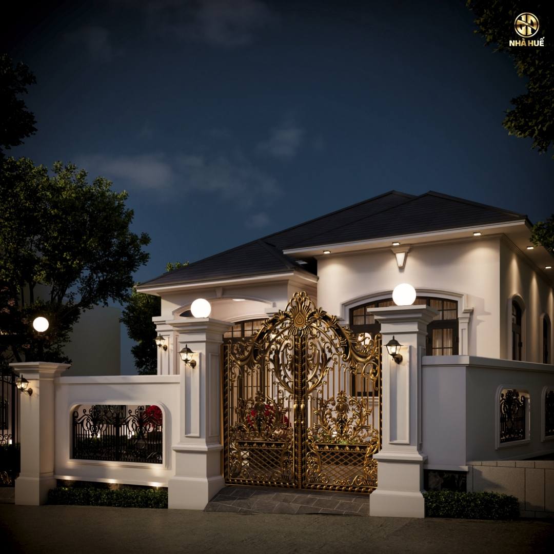 Cổng chính: Được làm từ nhôm đúc với hoa văn cầu kỳ mạ màu vàng đồng hoàng gia.Cổng phụ bằng sắt mỹ thuật màu đen đơn giản hơn để tạo sự thông thoáng. Tường rào xây kiên cố xen kẽ các ô thoáng nghệ thuật, đồng bộ với kiến trúc tổng thể.