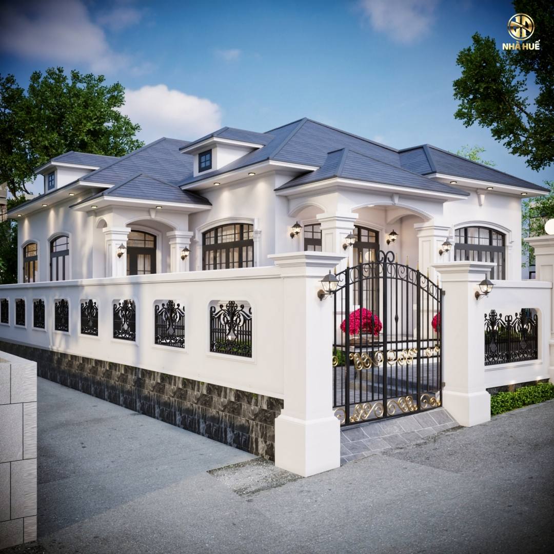 Tường rào: Được xây dựng kiên cố với các trụ cột vuông lớn đồng nhất với kiến trúc nhà. Giữa các mảng tường có các ô thoáng lắp khung sắt nghệ thuật, giúp ngôi nhà không bị bí bách mà vẫn đảm bảo an ninh.Trên mỗi đỉnh cột rào đều được bố trí đèn cầu sân vườn hoặc đèn tường cổ điển, vừa để chiếu sáng vừa tăng tính thẩm mỹ vào ban đêm.