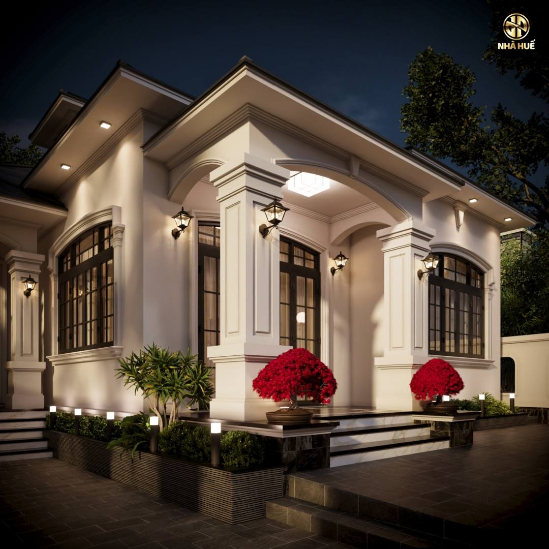 Công trình được bố trí hệ thống đèn tường cổ điển và đèn LED âm trần, kết hợp với các đèn trụ sân vườn thấp, tạo nên vẻ đẹp lung linh và ấm áp khi về đêm.