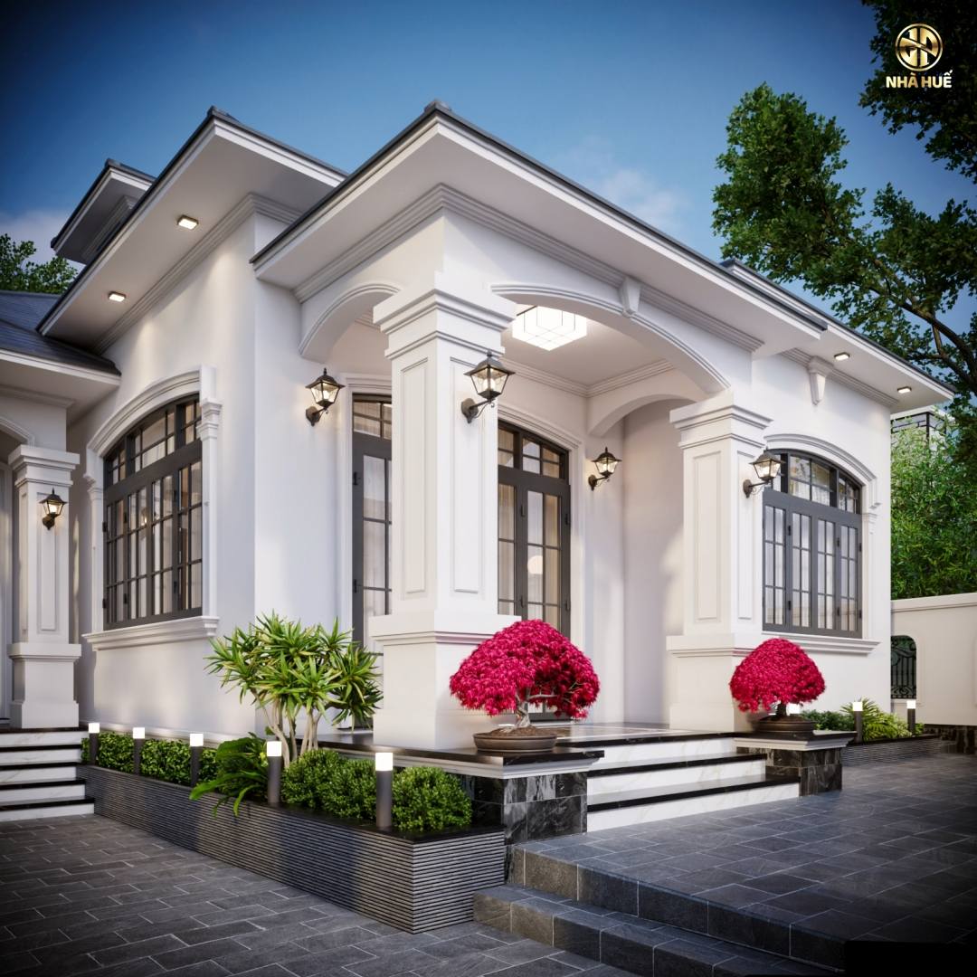 Màu trắng sứ chủ đạo mang lại cảm giác sạch sẽ, sang trọng và làm nổi bật các chi tiết kiến trúc.Phần chân đế và bậc tam cấp được ốp đá marble đen vân mây sang trọng.Bồn hoa phía trước được ốp gạch trang trí màu xám ghi với các đường kẻ sọc tinh tế.Ngôi nhà được bố trí hệ thống đèn tường phong cách cổ điển tại các cột trụ và đèn LED âm trần dưới mái, tạo hiệu ứng lung linh vào buổi tối.